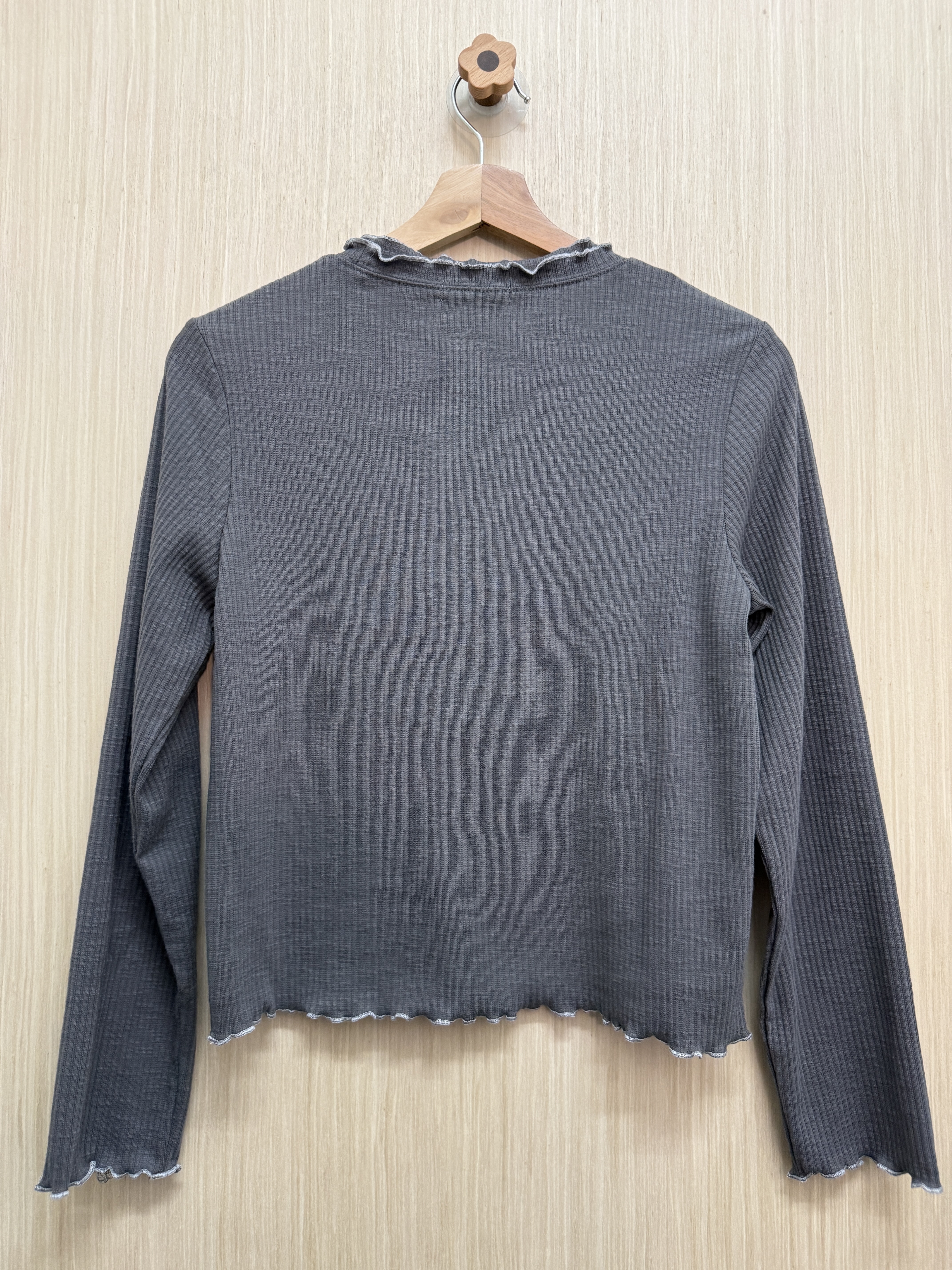 🔖 【撞色邊木耳領𝐭𝐨𝐩】 ✦顏色:深灰 ✦𝐒𝐢𝐳𝐞:肩闊𝟑𝟖𝐜𝐦 袖長𝟓𝟔𝐜𝐦 胸圍𝟑𝟗“吋 衣長𝟓𝟐𝐜𝐦