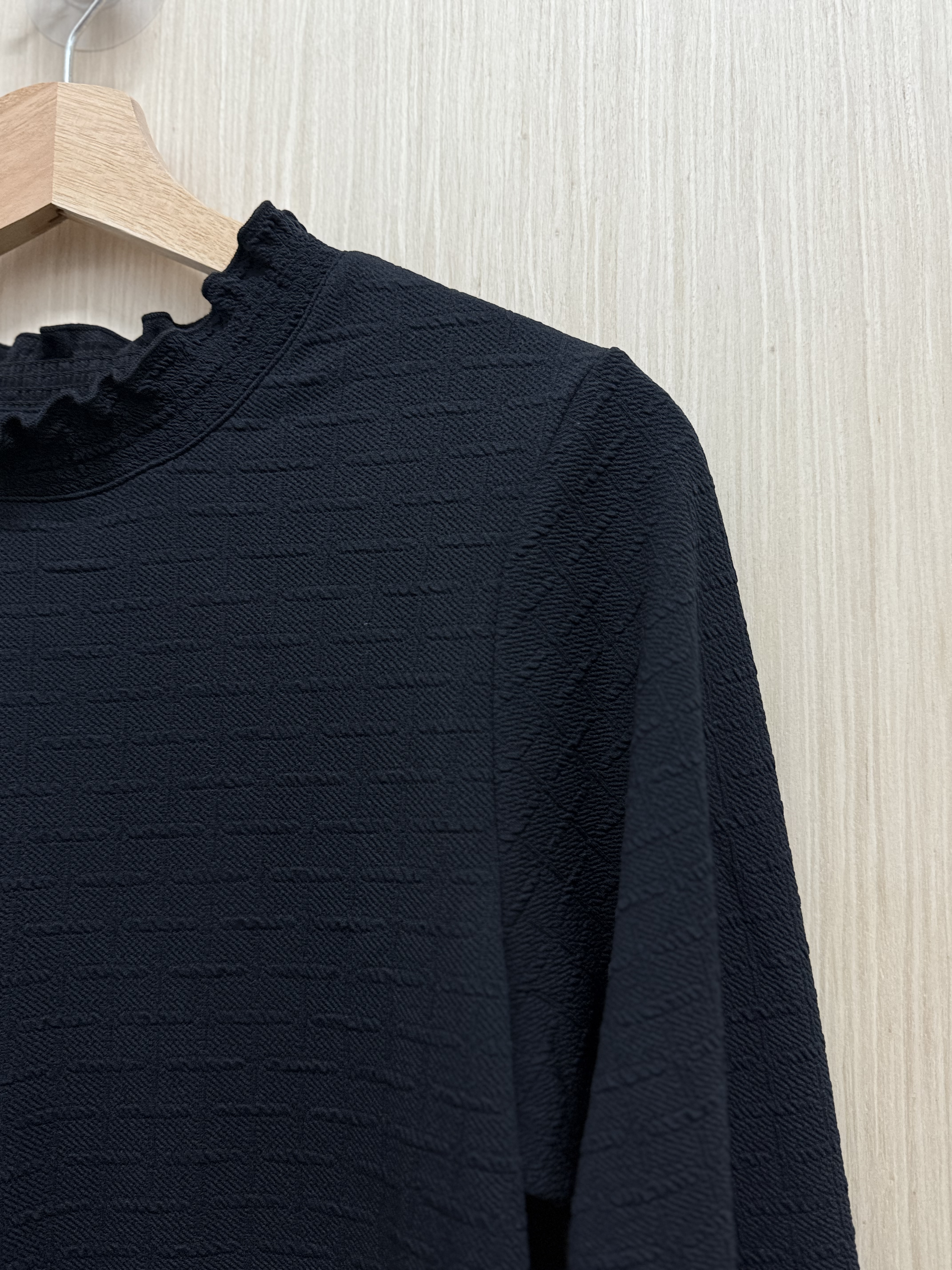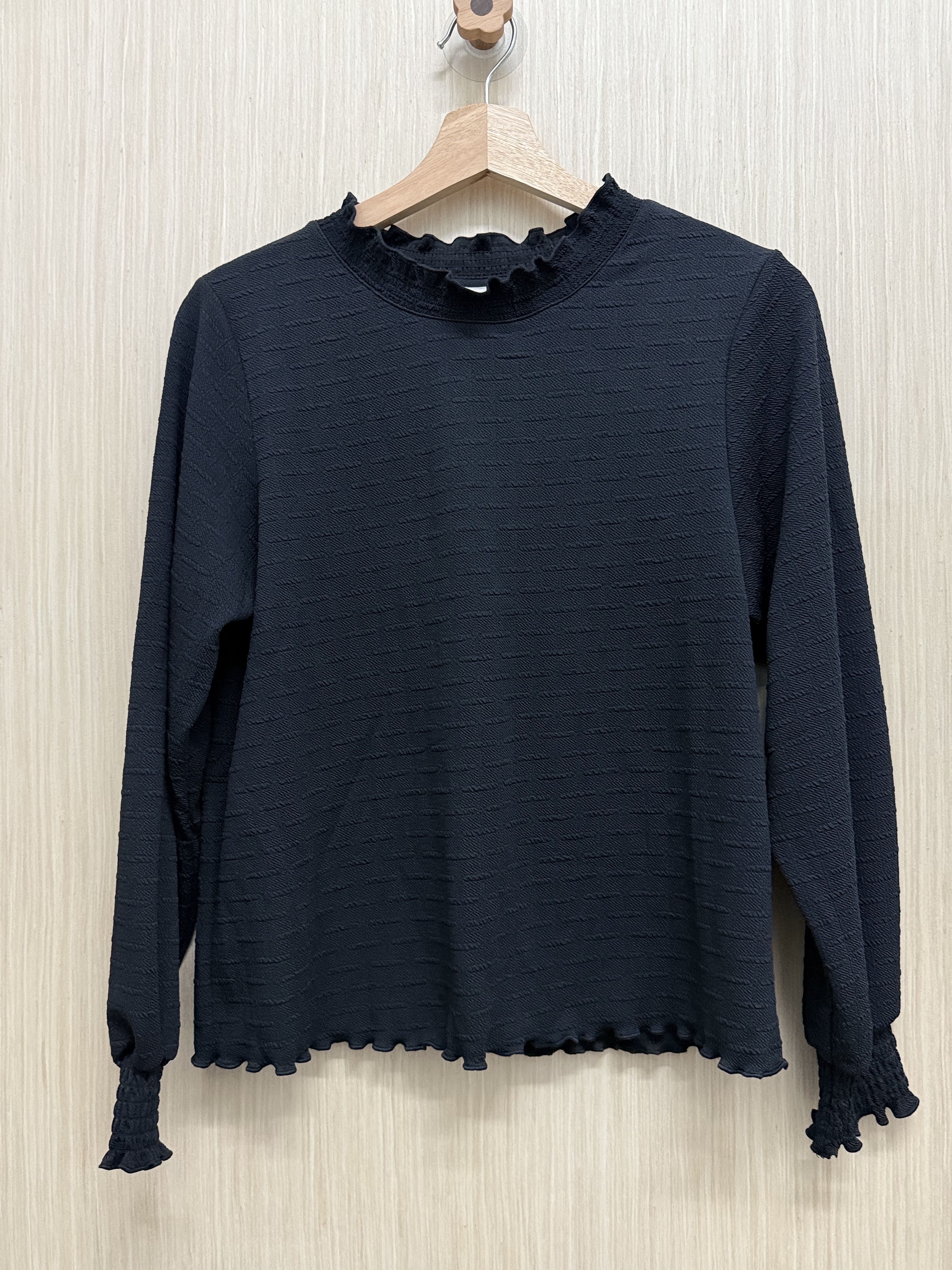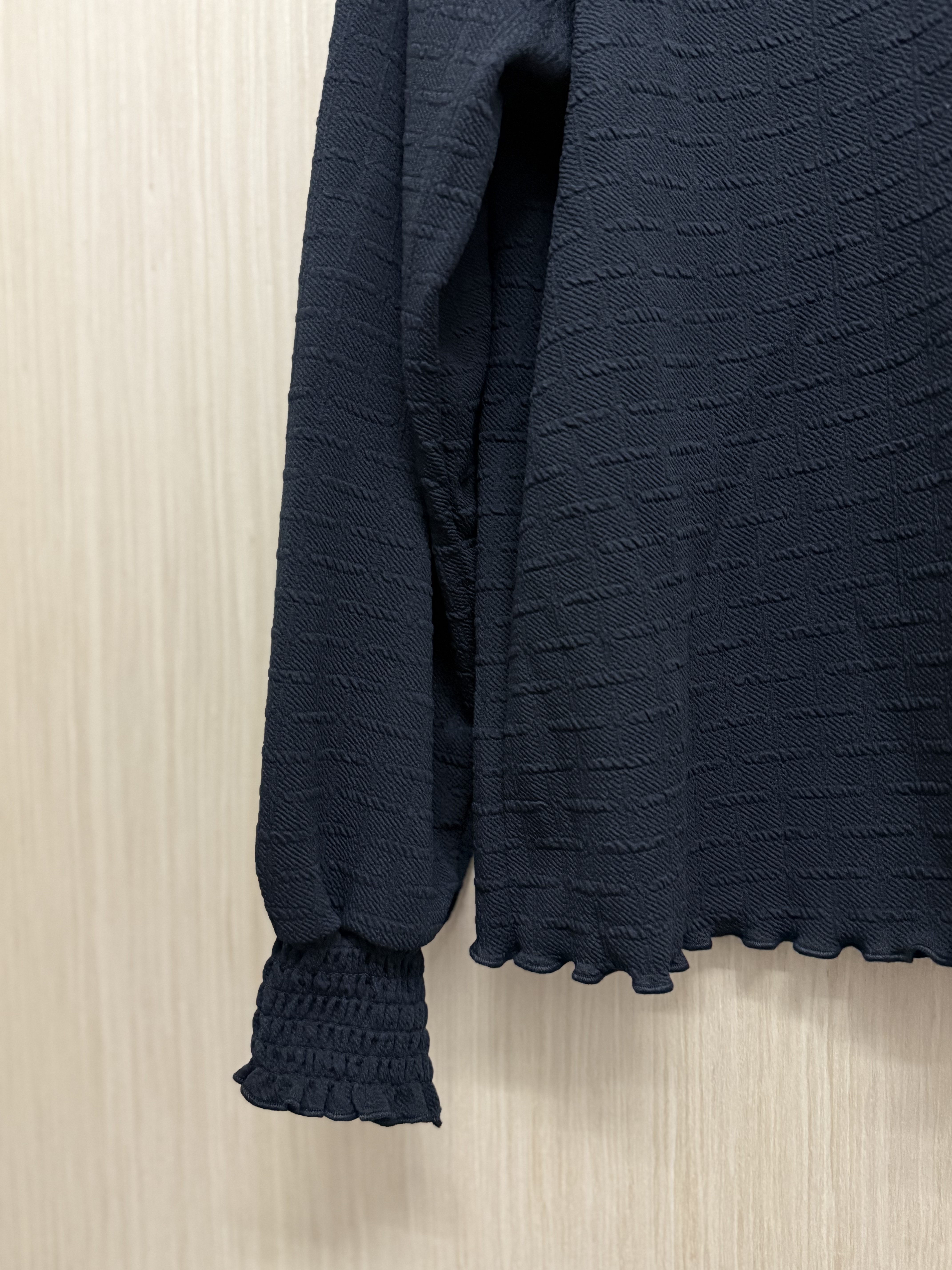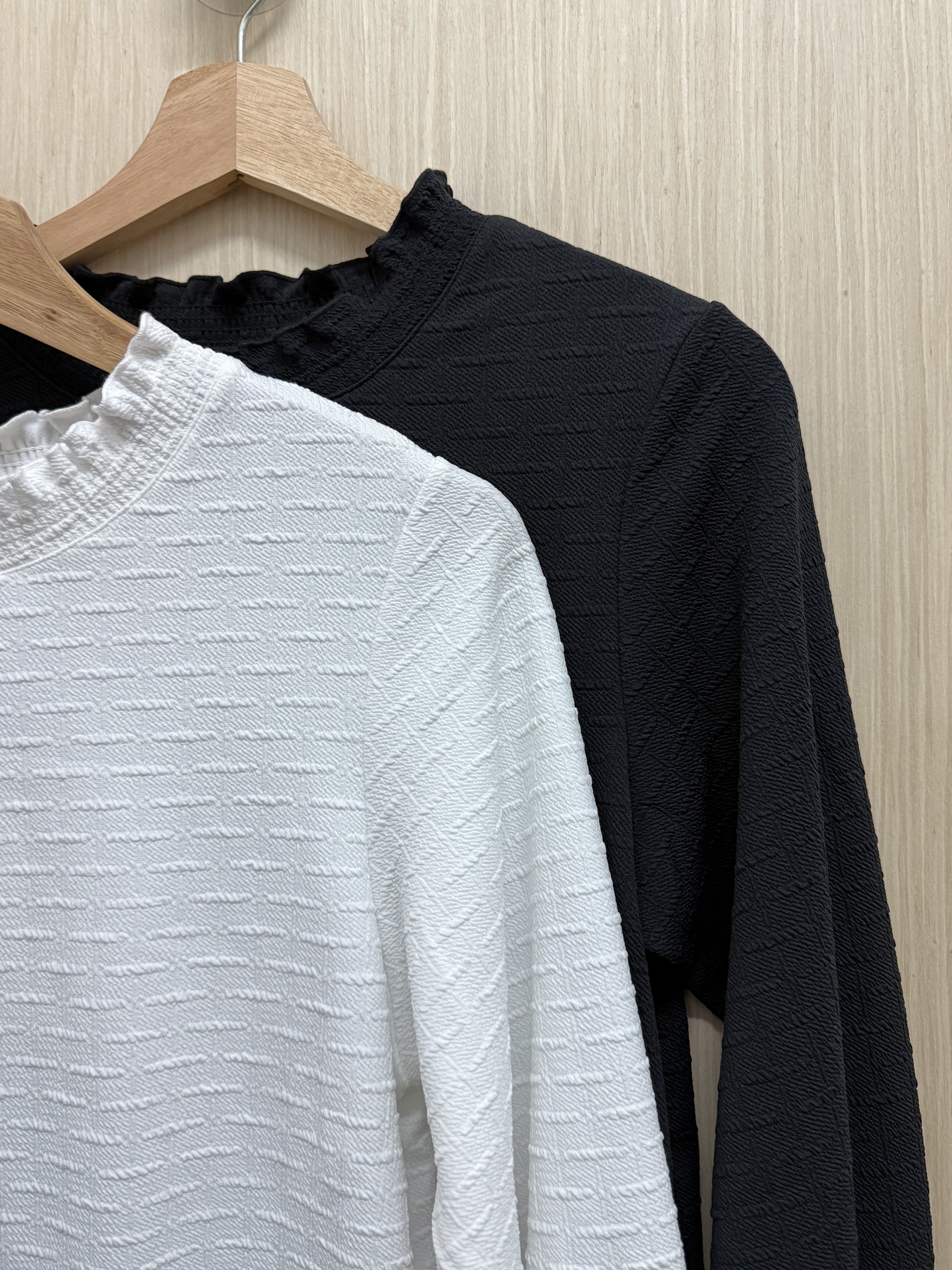 🔖 【橡筋袖木耳領暗紋𝐭𝐨𝐩】 ✦顏色:黑色 / 白色 ✦𝐒𝐢𝐳𝐞:肩闊𝟑𝟖𝐜𝐦 胸圍𝟒𝟐“吋 袖長𝟓𝟖𝐜𝐦 衣長𝟓𝟑𝐜𝐦