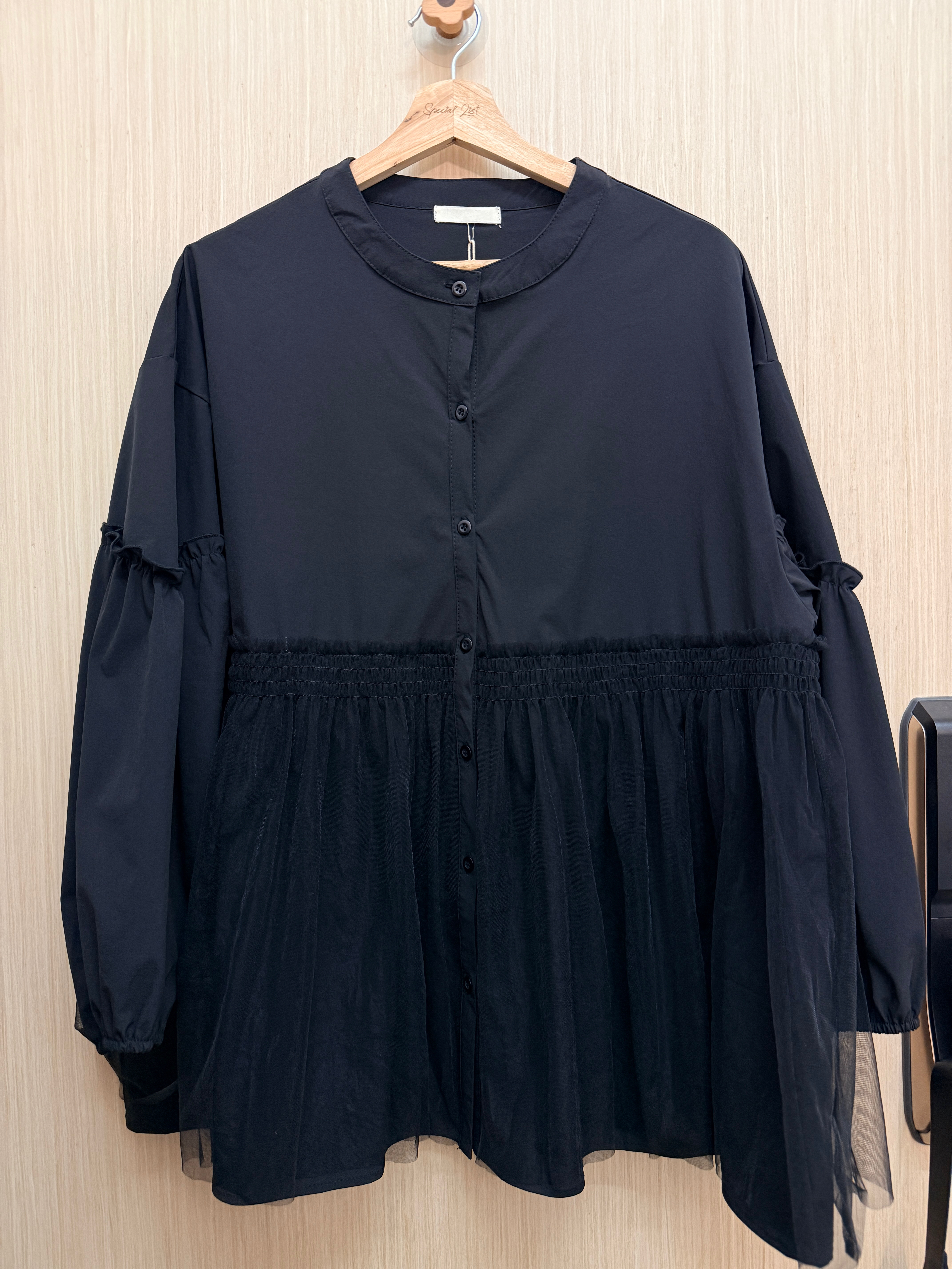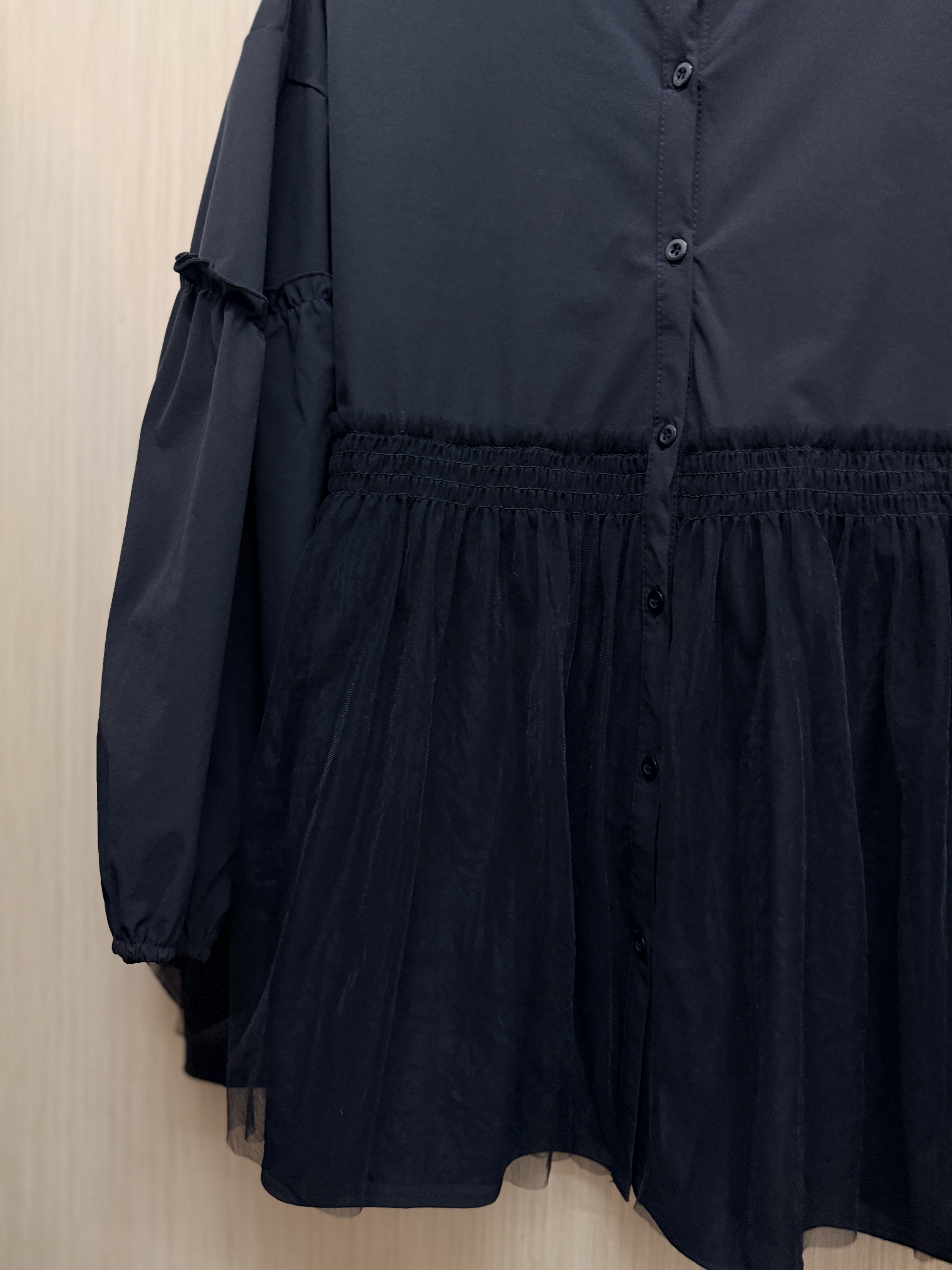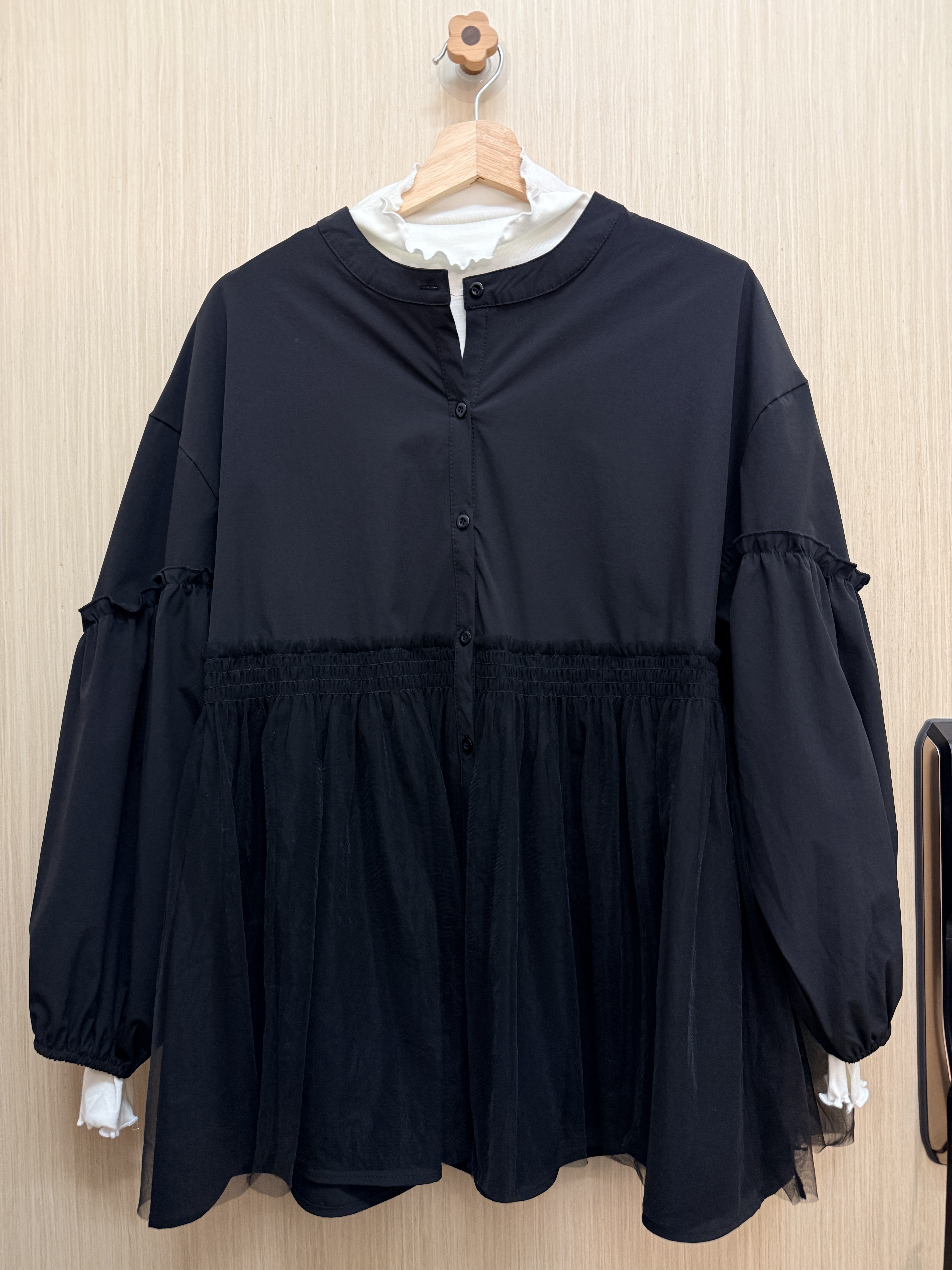 🔖 【索索料拼紗恤衫】 ✦顏色:黑色 ✦𝐒𝐢𝐳𝐞:肩闊𝟒𝟓𝐜𝐦 胸圍𝟒𝟔“吋 袖長𝟒𝟖𝐜𝐦 衣長𝟕𝟑𝐜𝐦